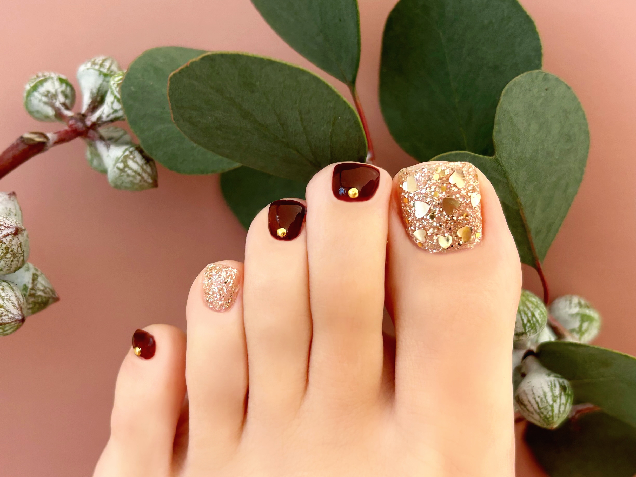 ゴールドのラメにハートのホログラムをのせたデザイン☆同系色にする事でラブリー過ぎず大人っぽく、可愛らしい印象に♪ボルドーでより大人っぽく♪